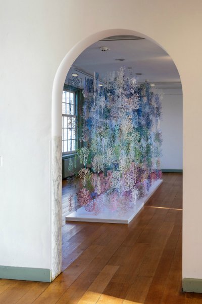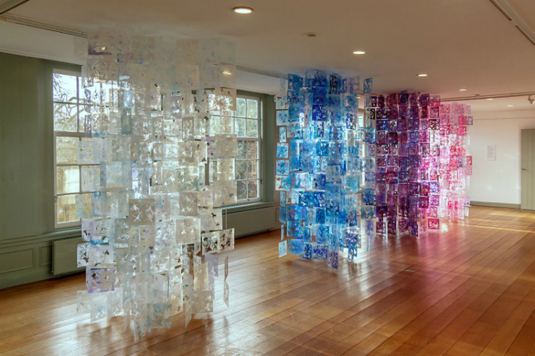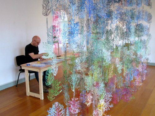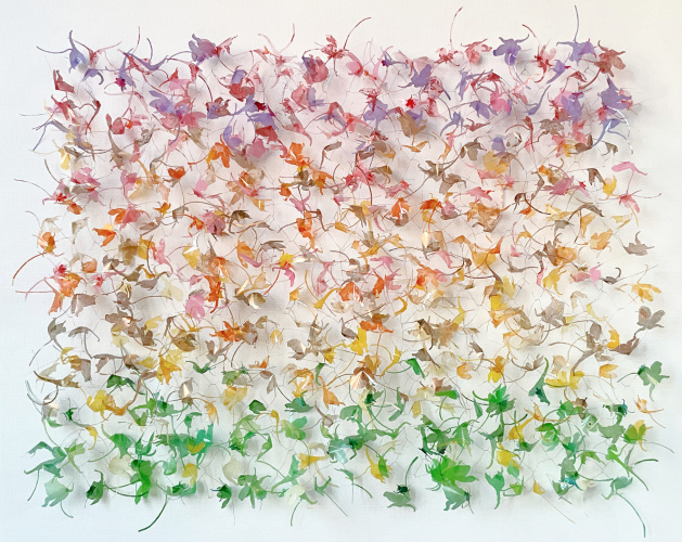 De papierwerken worden overigens ook weleens in ander materiaal uitgevoerd, zoals bedrukt kunststof sheets of perspex. De werken zijn deconstructies van de natuur (onderdelen van planten worden herschikt) of een ode aan “de onregelmatigheid van de regelmaat” uit de natuur (scholen vissen, zwermen bijen en bloemperken).