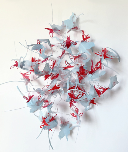 Behalve op papier werk ik ook met papier. Ik monteer papiersilhouetten op monoprints of hang ze los in de ruimte. Meestal verbinden ijzerdraad of nylon garen de losse elementen tot wandstructuren.