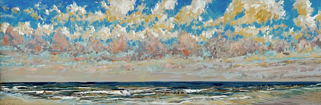 Sinds 2018 teken ik – zo vaak het kan – en plein air op het strand. Altijd met pastelkrijt en altijd op dezelfde plek: strandhuisje 3 bij de Texelse Beachclub. Van ’s ochtends vroeg (meestal 7 uur) totdat de zon in mijn gezicht draait. Ik maak de pastels van begin tot einde ter plekke, in één sessie. Zo komen de energie en beweging van het landschap en mijn energie het beste samen.